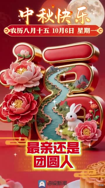 • 中秋快樂!今天是農歷八月十五中秋節!最明不過中秋月,最親還是團圓人!餅香邀月,茶暖情長,共賞明月。中秋安康,海報新聞祝您闔家幸福,諸事順遂。